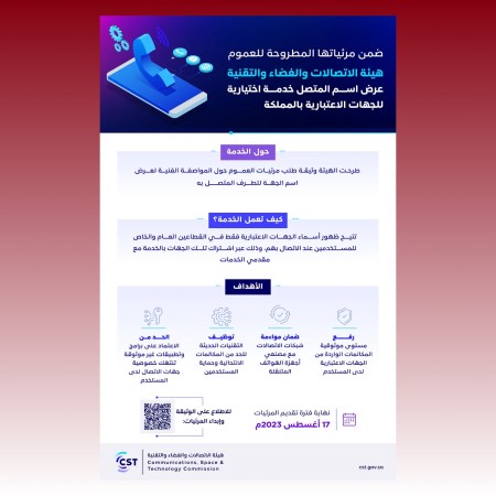 أعلنت هيئة الاتصالات والفضاء والتقنية عن طرحها لوثيقة طلب مرئيات العموم حيال المواصفة الفنية لعرض اسم الجهة للطرف المتصل به، والمتضمنة للمعايير الفنية التي يجب اتباعها في شبكات الاتصالات وأجهزة الهواتف المتنقلة لدعم وتفعيل الخدمة، حيث ستتيح الخدمة ظهور أسماء الجهات الاعتبارية فقط للمستخدمين سواء كانت حكومية أو خاصة عند الاتصال بهم، وذلك عبر اشتراك تلك الجهات بالخدمة مع مقدمي الخدمات.