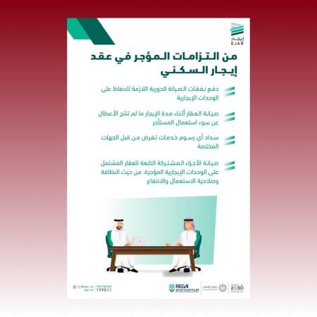 وكشفت “إيجار” عن التزامات المؤجر في العقد السكني والتي تشمل دفع نفقات الصيانة الدورية اللازمة للحفاظ على الوحدات الإيجارية، وصيانة العقار أثناء مدة الإيجار ما لم تكون ناتجة عن سوء استخدام المستأجر، وسداد أي رسوم خدمات تفرض من قبل الجهات المختصة، بالإضافة لصيانة الأجزاء المشتركة التابعة للعقار المشتمل على الوحدات المؤجرة، من حيث النظافة وصلاحية الاستعمال والانتفاع.