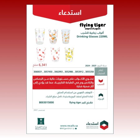 أعلنت وزارة التجارة السعودية عن استدعاء 6,341 كوبًا زجاجيًا للشرب سعة 220 مل من علامة Flying Tiger، وذلك ضمن منتجات تم تداولها خلال عامي 2024 و2025، في إطار جهودها المستمرة لحماية المستهلكين وضمان سلامة المنتجات في الأسواق.