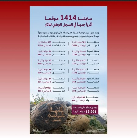 أعلنت هيئة التراث عن تسجيل 1414 موقعًا أثريًا جديدًا في السجل الوطني للآثار، لتشمل كافة مناطق المملكة، في خطوة تعكس استمرار الجهود الوطنية لحصر وتوثيق المواقع الأثرية وتعزيز حضورها في الذاكرة الثقافية والتراثية.